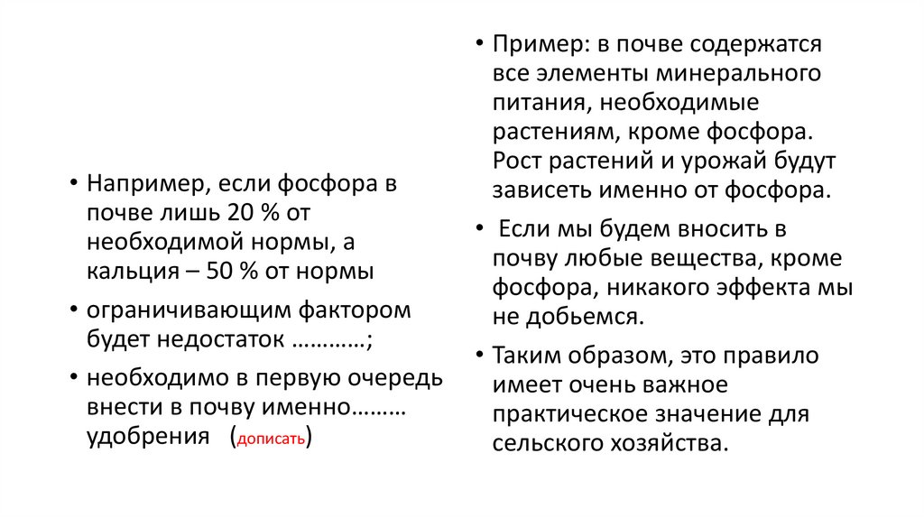 12. «Успешную жизнедеятельность организма ограничивает фактор, количество и качество которого близко к минимальному»