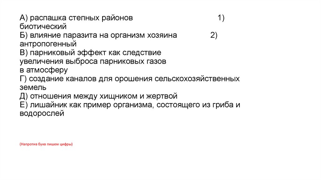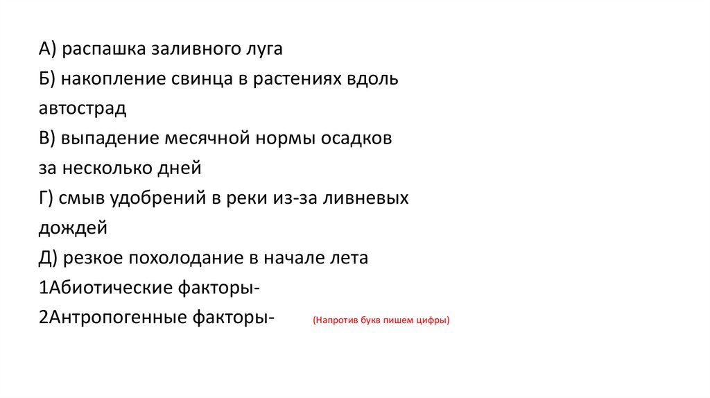 1Абиотические факторы2Антропогенные факторы(Напротив букв пишем цифры)