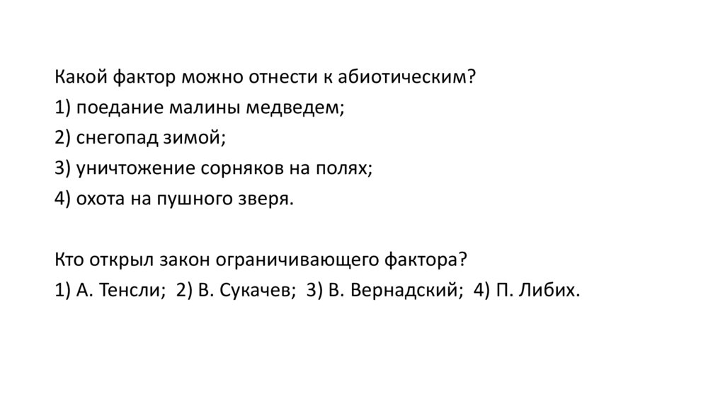 Какой фактор можно отнести к абиотическим?1) поедание малины медведем;