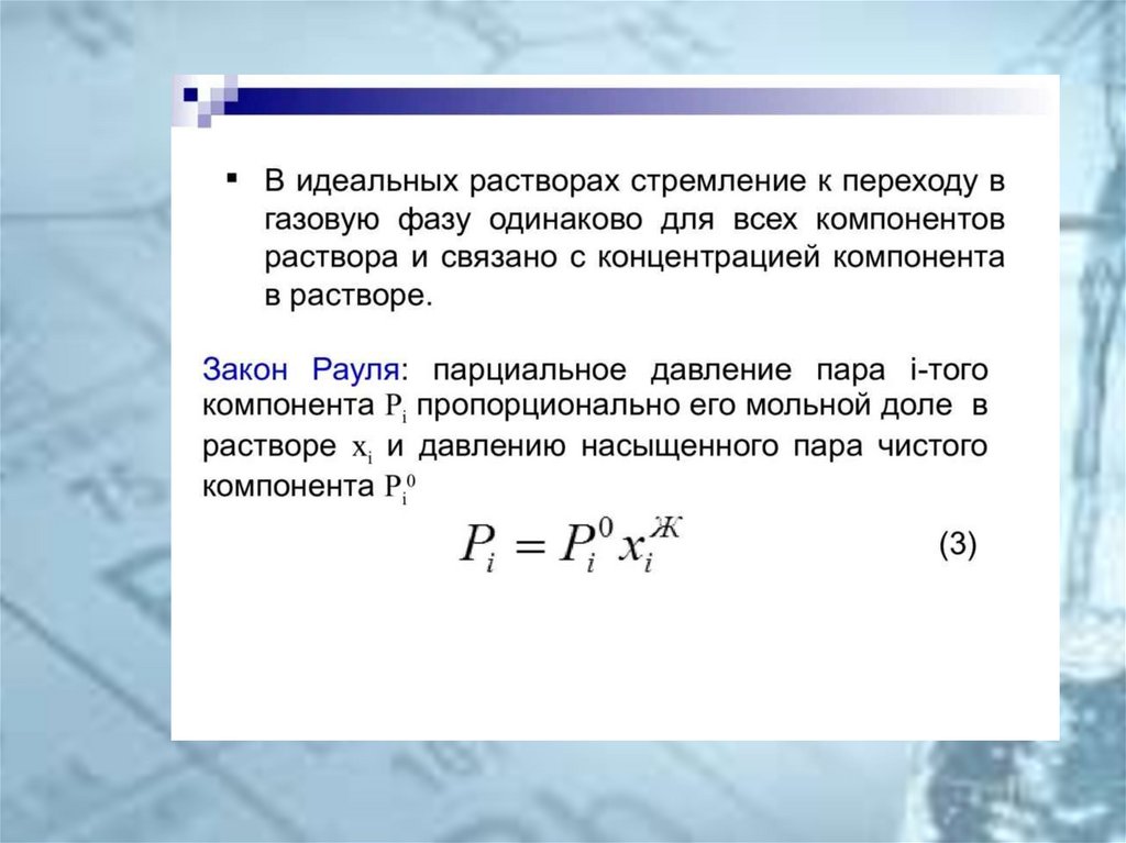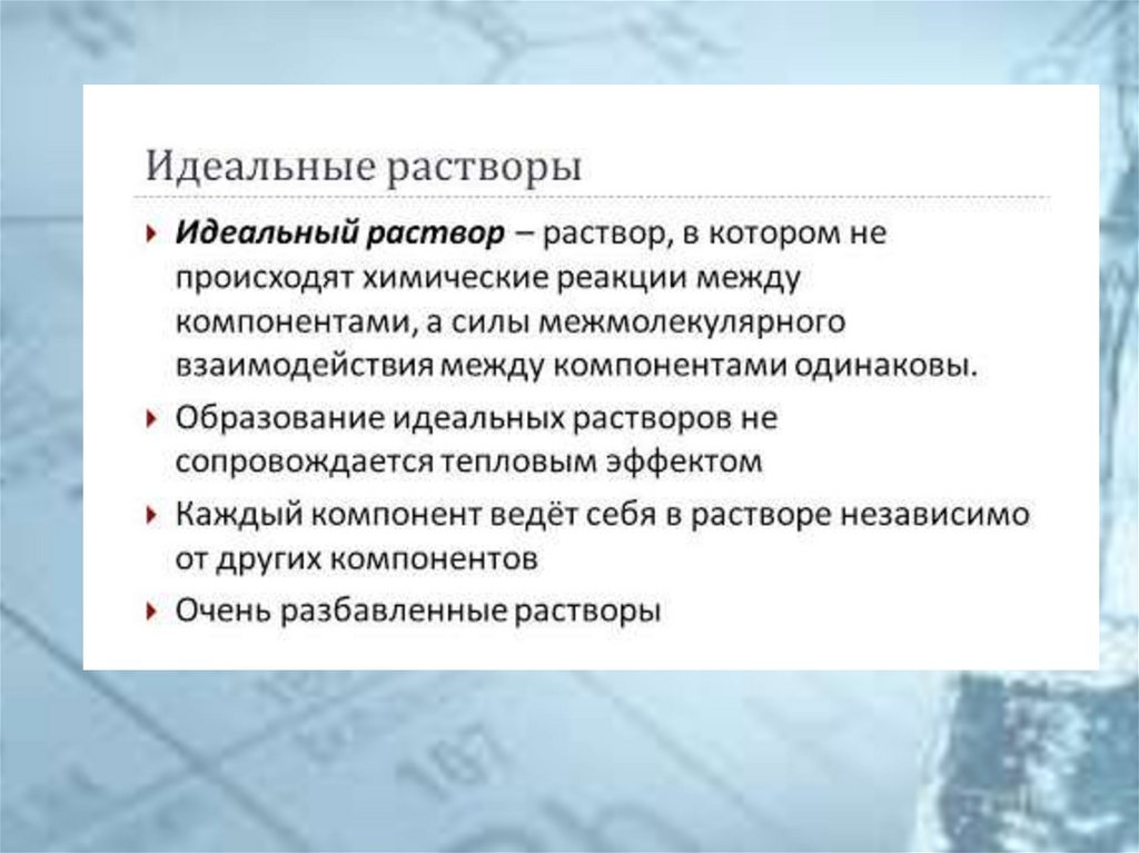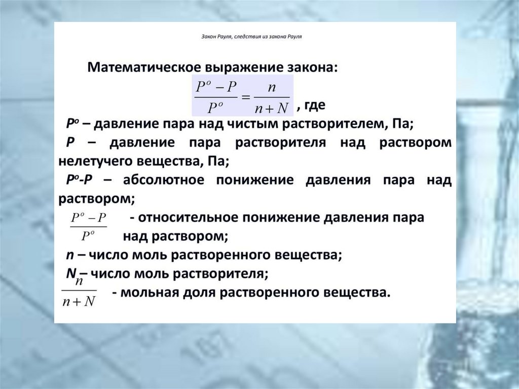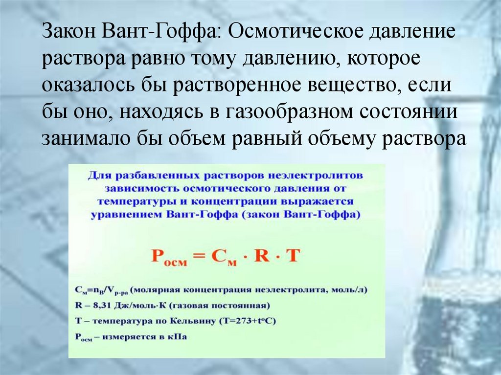 Закон Вант-Гоффа: Осмотическое давлениераствора равно тому давлению, которое