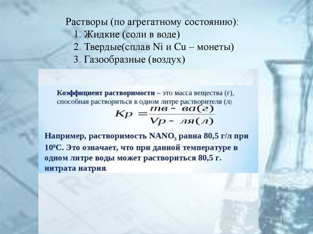Растворы (по агрегатному состоянию):1. Жидкие (соли в воде)