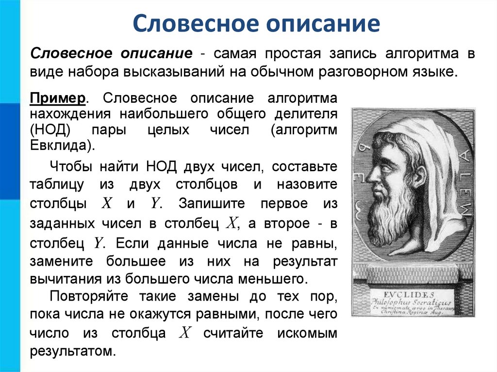 Словесное описаниеСловесное описание - самая простая запись алгоритма в