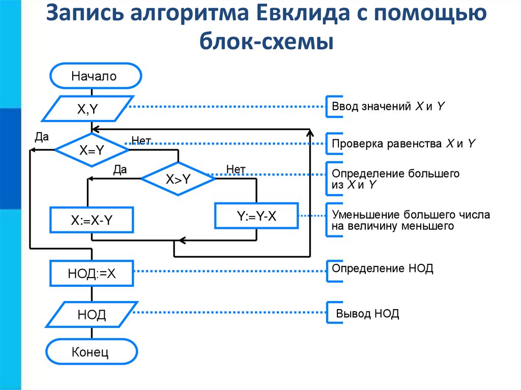 Запись алгоритма Евклида с помощьюблок-схемы