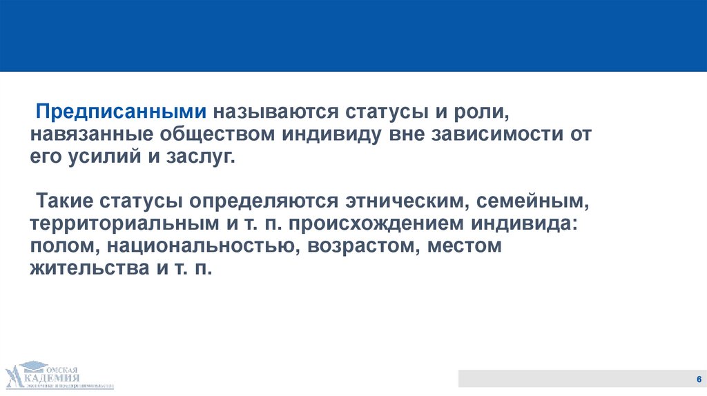Предписанными называются статусы и роли,навязанные обществом индивиду вне зависимости от