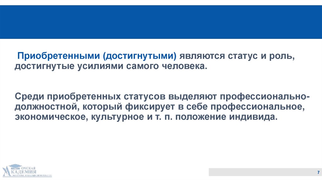Приобретенными (достигнутыми) являются статус и роль,достигнутые усилиями самого человека.