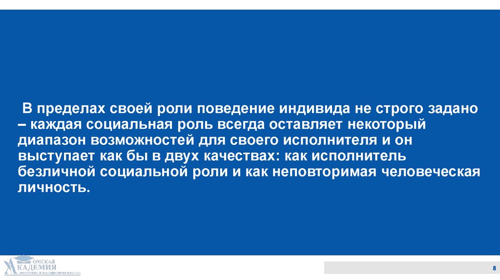 В пределах своей роли поведение индивида не строго задано– каждая социальная роль всегда оставляет некоторый