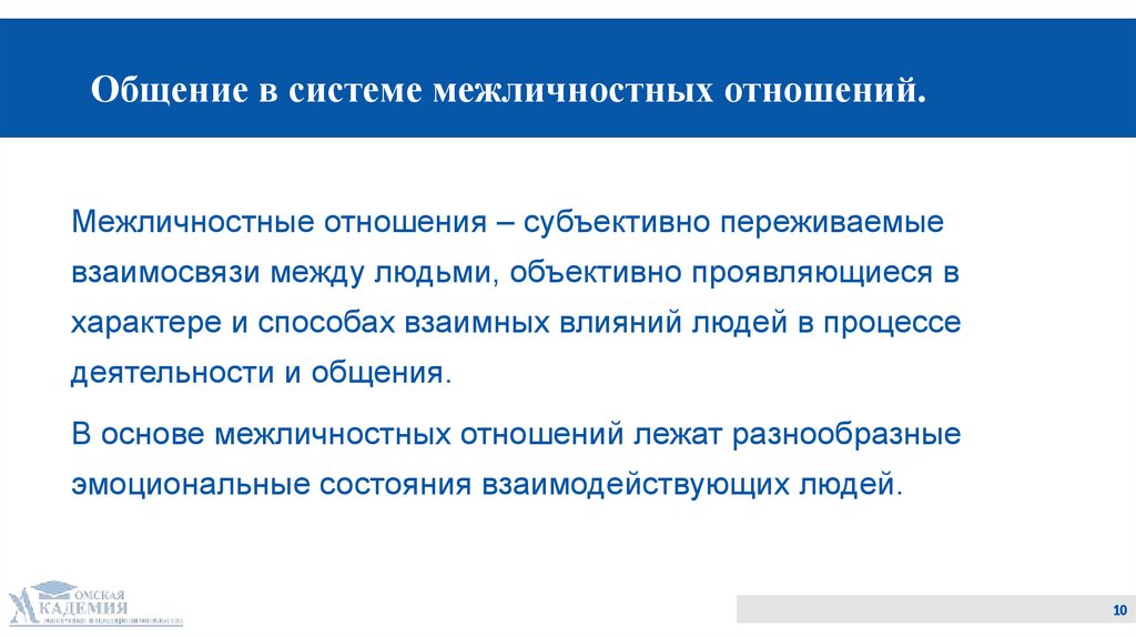 Общение в системе межличностных отношений.Межличностные отношения – субъективно переживаемые
