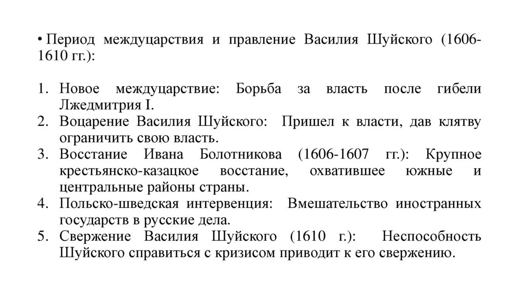 • Период междуцарствия и правление Василия Шуйского (16061610 гг.):1. Новое междуцарствие: Борьба за власть после гибели
