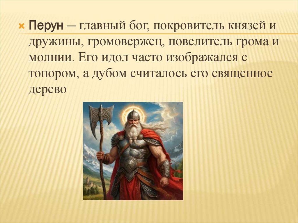 Перун — главный бог, покровитель князей идружины, громовержец, повелитель грома и