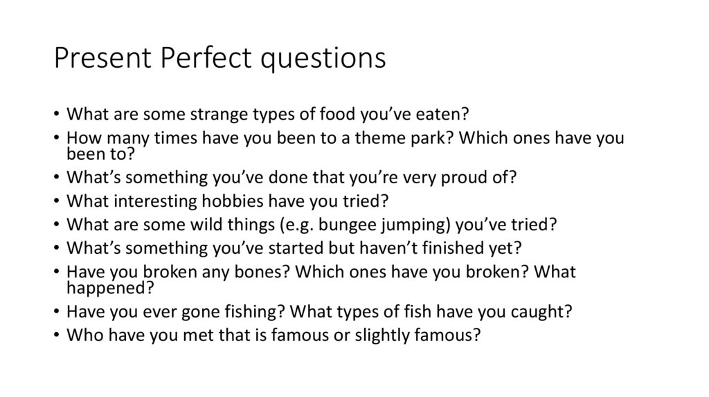 • What are some strange types of food you’ve eaten?• How many times have you been to a theme park? Which ones have you