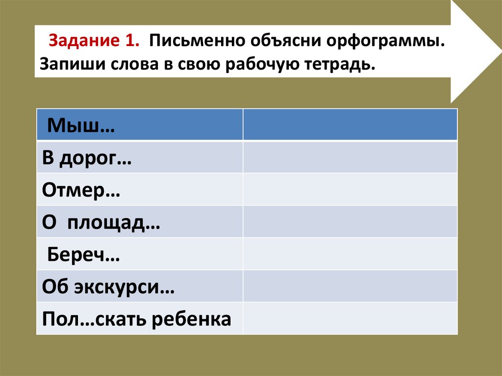Задание 1. Письменно объясни орфограммы.Запиши слова в свою рабочую тетрадь.