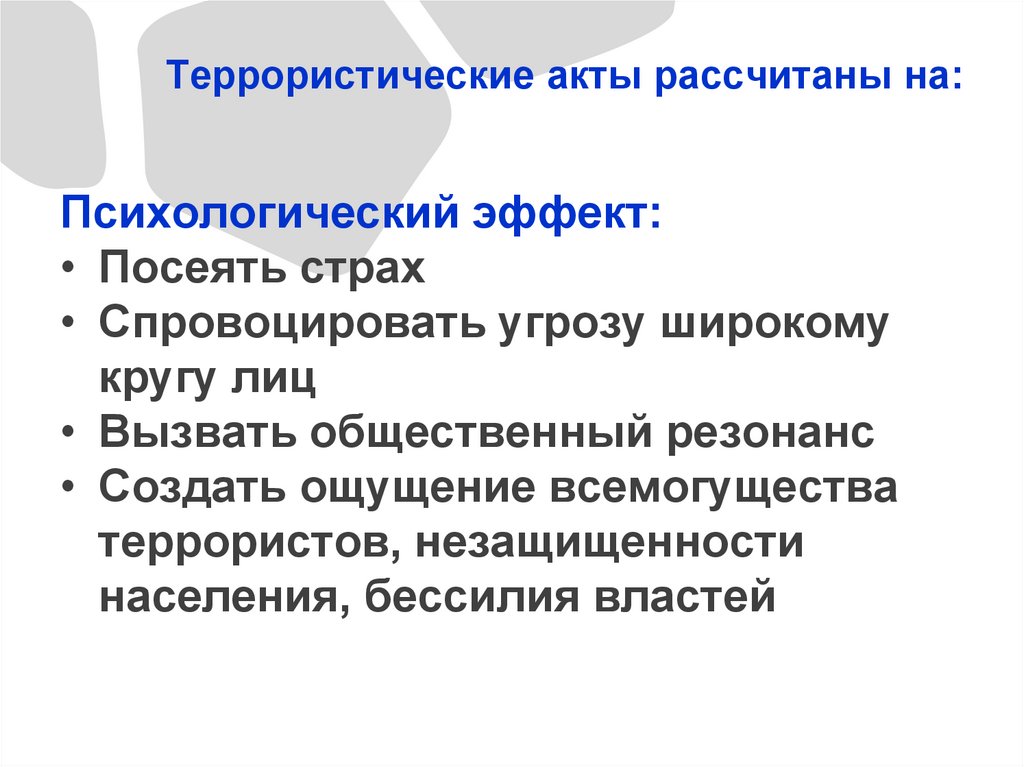 Террористические акты рассчитаны на:Психологический эффект: