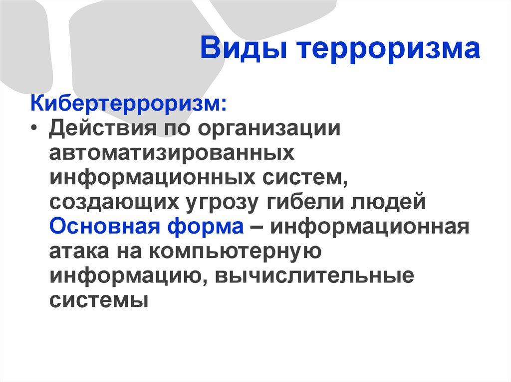 Виды терроризмаКибертерроризм: