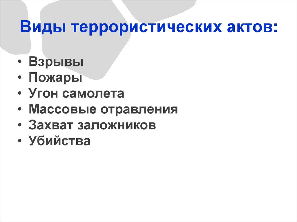 Виды террористических актов:• Взрывы