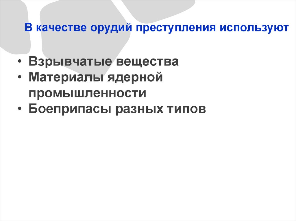 В качестве орудий преступления используют• Взрывчатые вещества