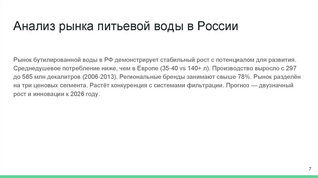 Анализ рынка питьевой воды в РоссииРынок бутилированной воды в РФ демонстрирует стабильный рост с потенциалом для развития.