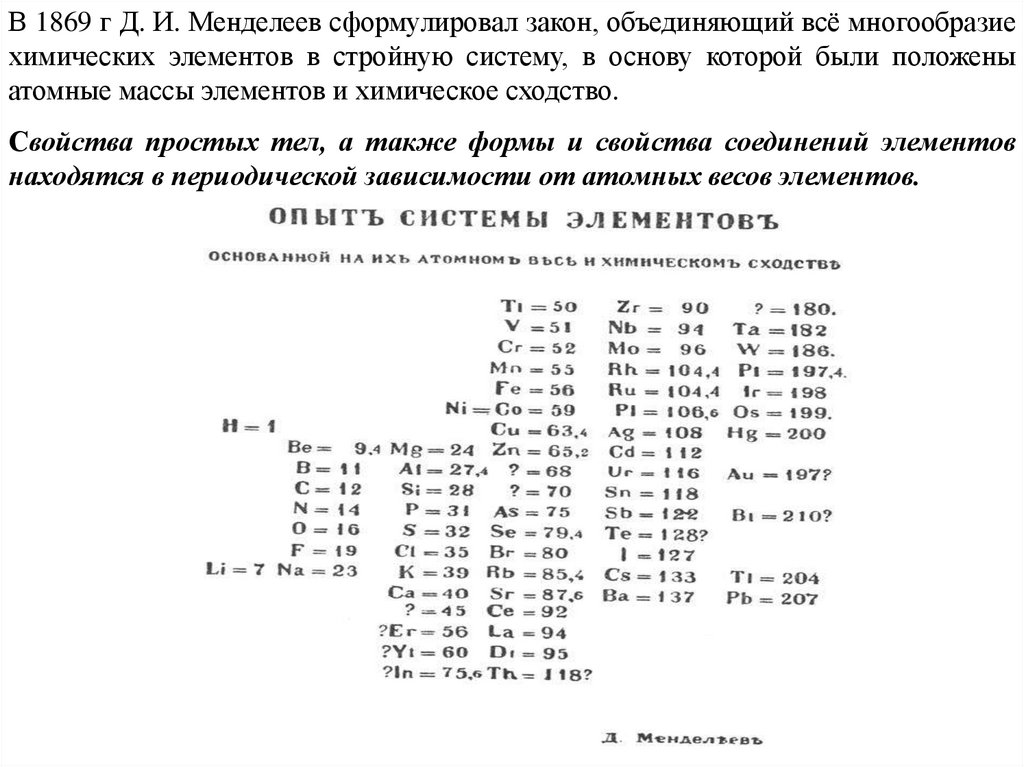 В 1869 г Д. И. Менделеев сформулировал закон, объединяющий всё многообразиехимических элементов в стройную систему, в основу которой были положены