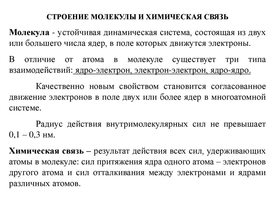 СТРОЕНИЕ МОЛЕКУЛЫ И ХИМИЧЕСКАЯ СВЯЗЬМолекула - устойчивая динамическая система, состоящая из двух