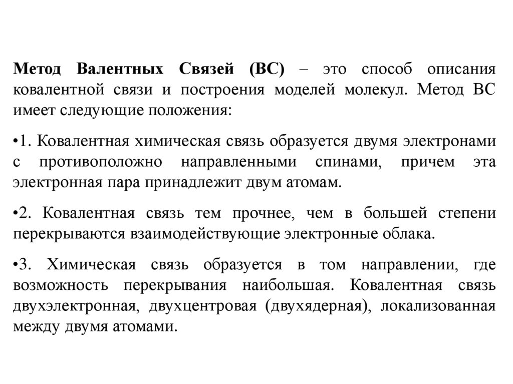 Метод Валентных Связей (ВС) – это способ описанияковалентной связи и построения моделей молекул. Метод ВС