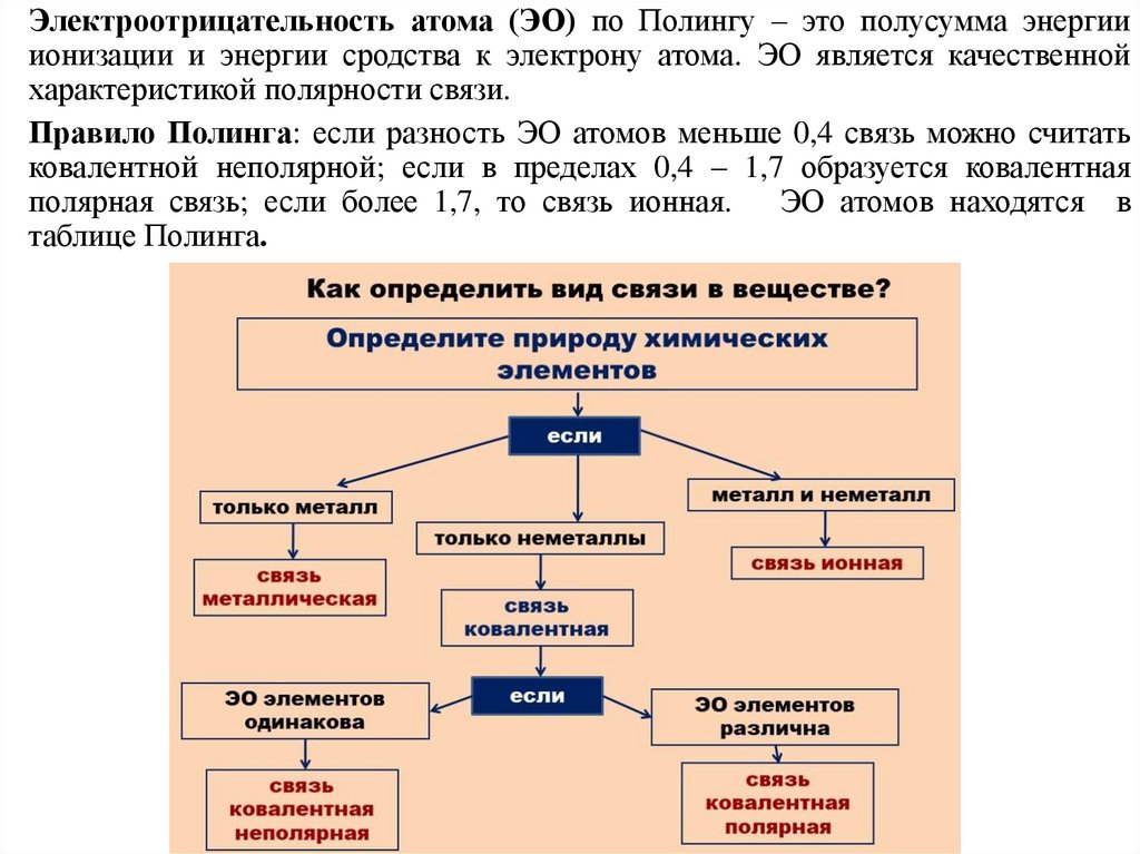 Электроотрицательность атома (ЭО) по Полингу – это полусумма энергииионизации и энергии сродства к электрону атома. ЭО является качественной
