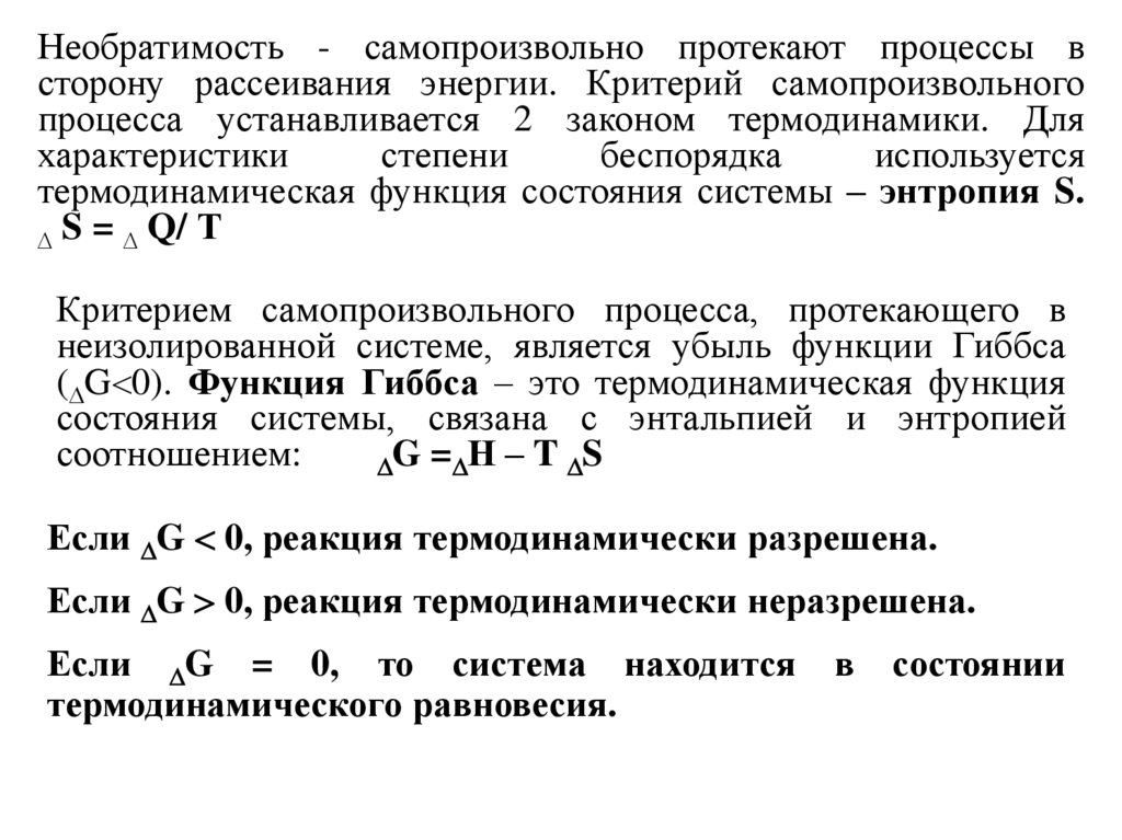Необратимость - самопроизвольно протекают процессы всторону рассеивания энергии. Критерий самопроизвольного