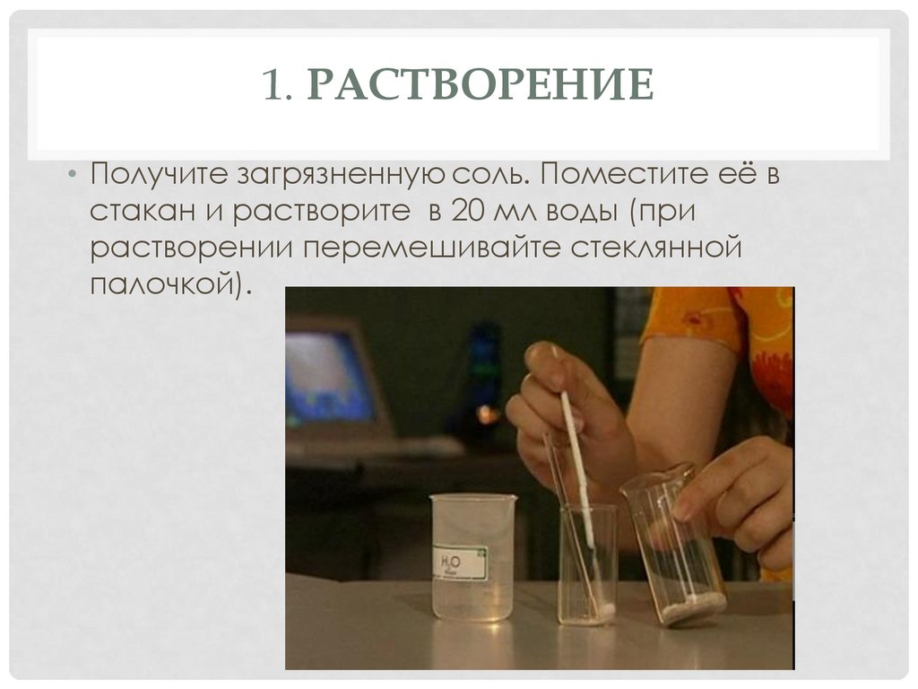 1. РАСТВОРЕНИЕ• Получите загрязненную соль. Поместите её в