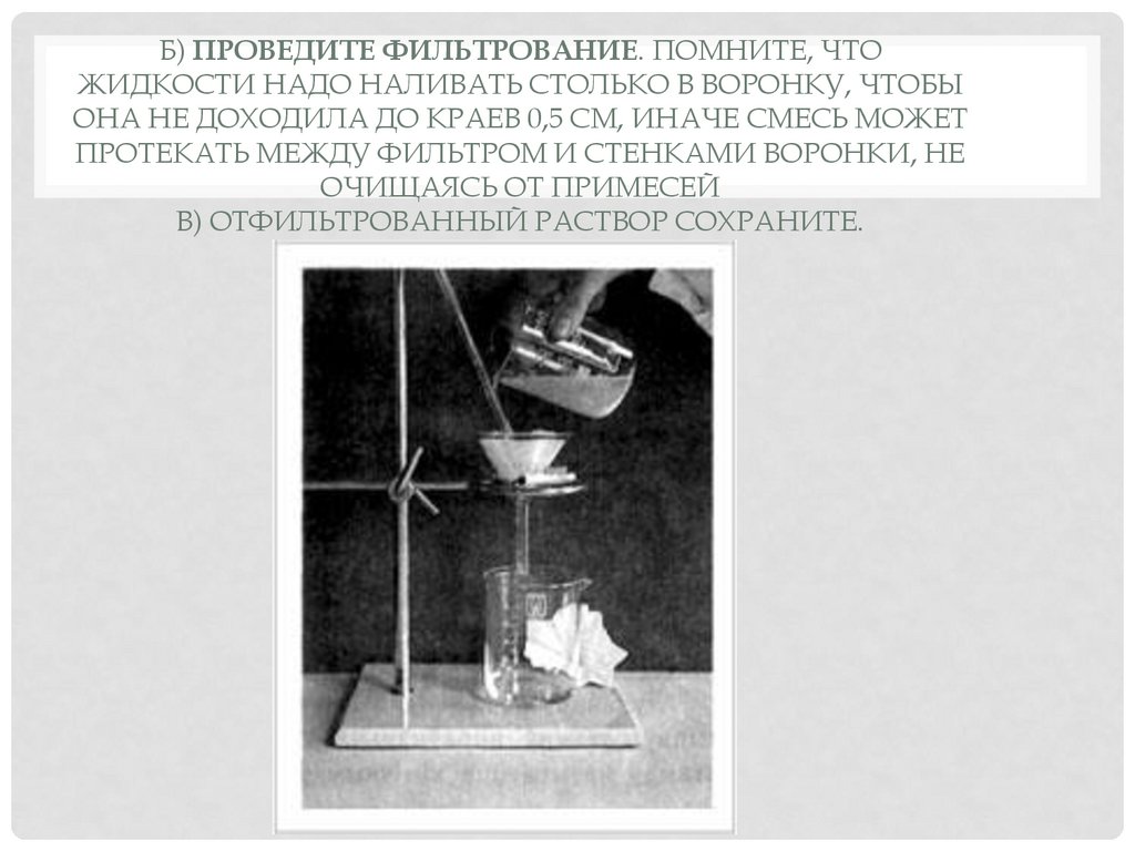 Б) ПРОВЕДИТЕ ФИЛЬТРОВАНИЕ. ПОМНИТЕ, ЧТОЖИДКОСТИ НАДО НАЛИВАТЬ СТОЛЬКО В ВОРОНКУ, ЧТОБЫ
