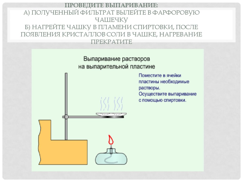ПРОВЕДИТЕ ВЫПАРИВАНИЕ:А) ПОЛУЧЕННЫЙ ФИЛЬТРАТ ВЫЛЕЙТЕ В ФАРФОРОВУЮ