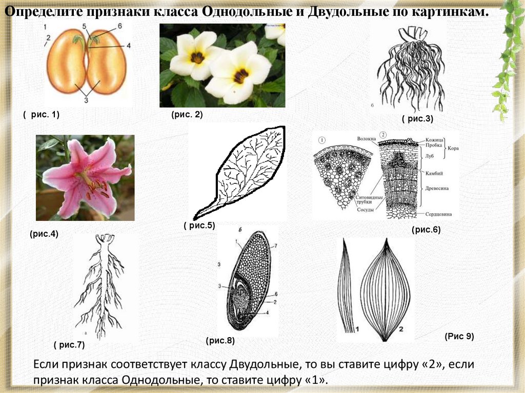 Определите признаки класса Однодольные и Двудольные по картинкам.( рис. 1)