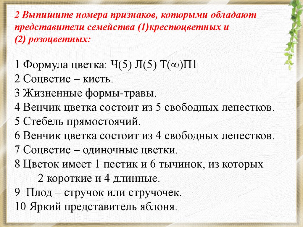 2 Выпишите номера признаков, которыми обладаютпредставители семейства (1)крестоцветных и