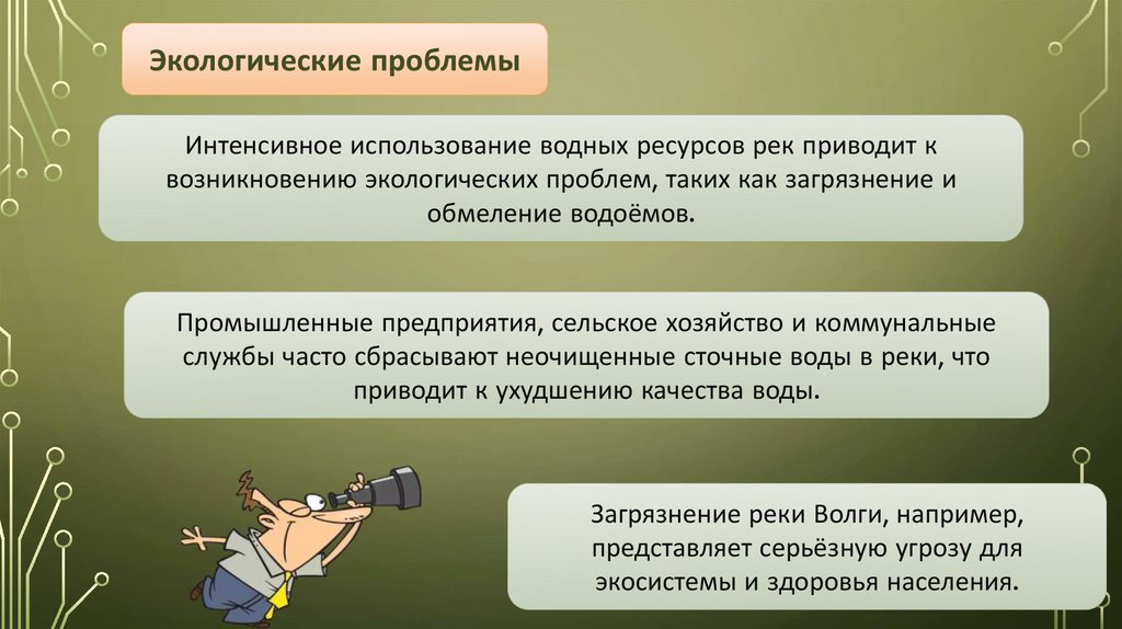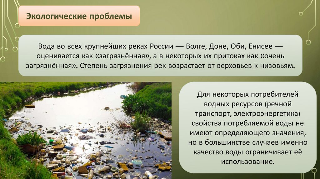 Экологические проблемыВода во всех крупнейших реках России — Волге, Доне, Оби, Енисее —