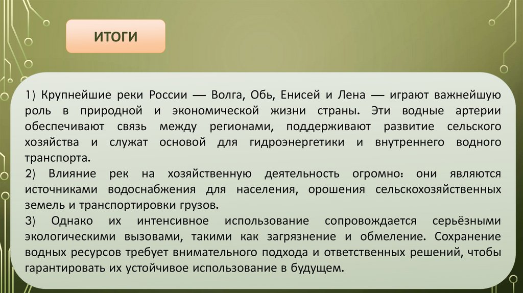ИТОГИ1) Крупнейшие реки России — Волга, Обь, Енисей и Лена — играют важнейшую