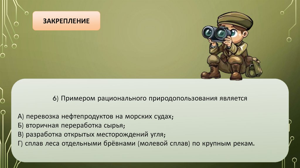 ЗАКРЕПЛЕНИЕ6) Примером рационального природопользования является