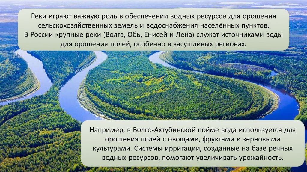 В России крупные реки (Волга, Обь, Енисей и Лена) служат источниками воды