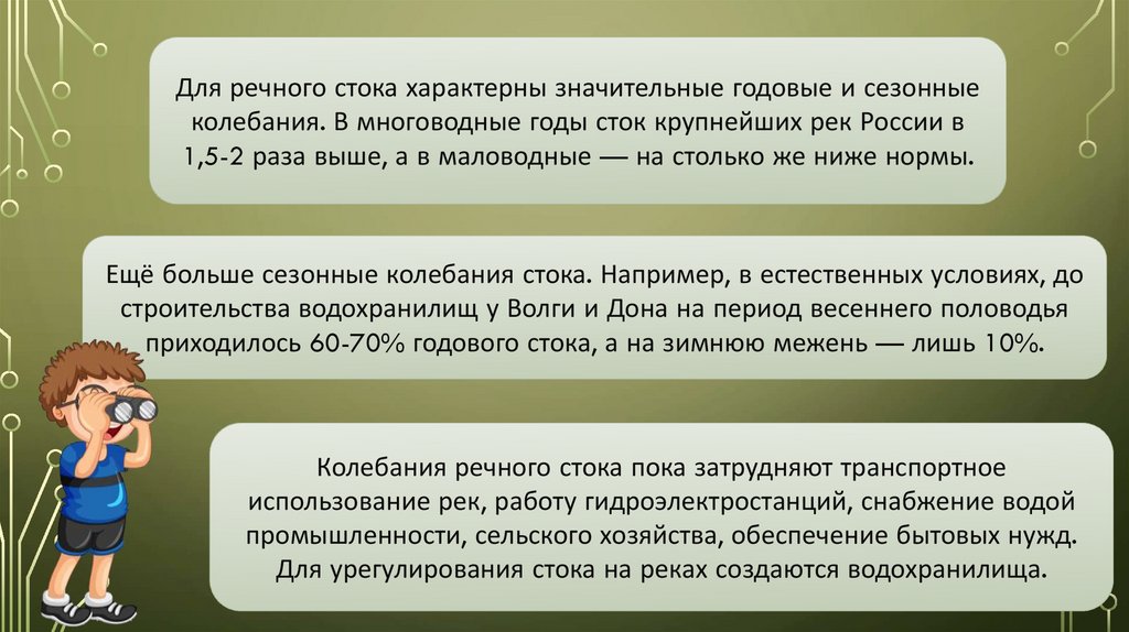 Для речного стока характерны значительные годовые и сезонныеколебания. В многоводные годы сток крупнейших рек России в