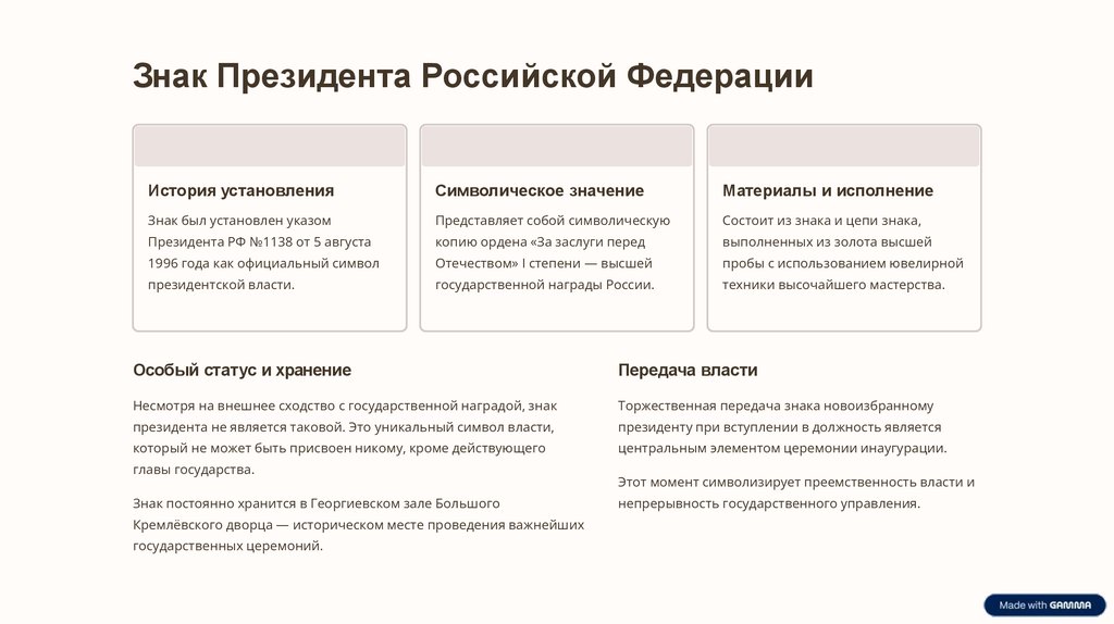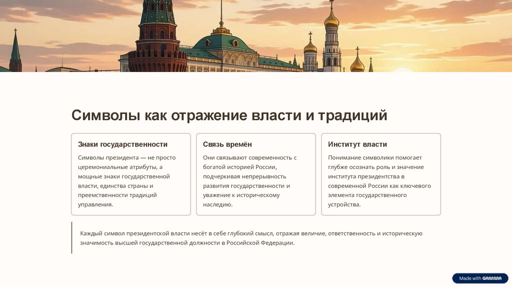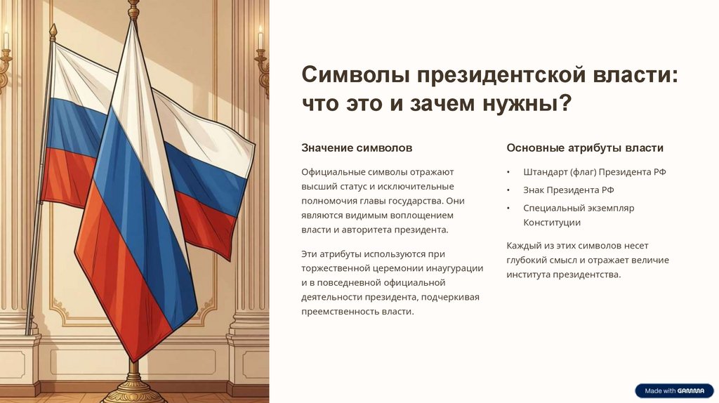 Каждый символ президентской власти несёт в себе глубокий смысл, отражая величие, ответственность и историческую