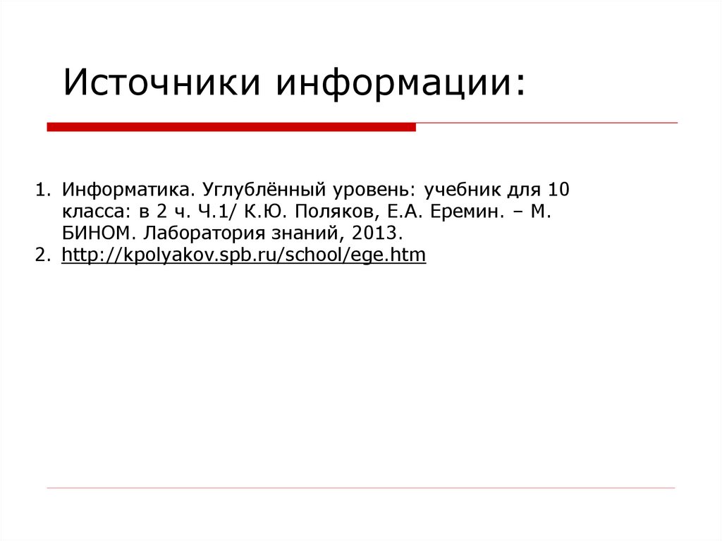 Источники информации:1. Информатика. Углублённый уровень: учебник для 10