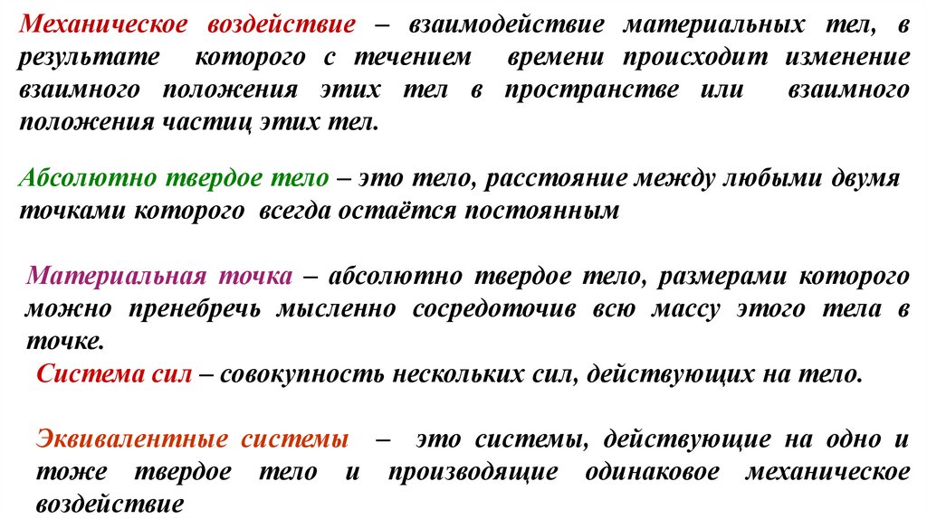 Механическое воздействие – взаимодействие материальных тел, врезультате которого с течением времени происходит изменение