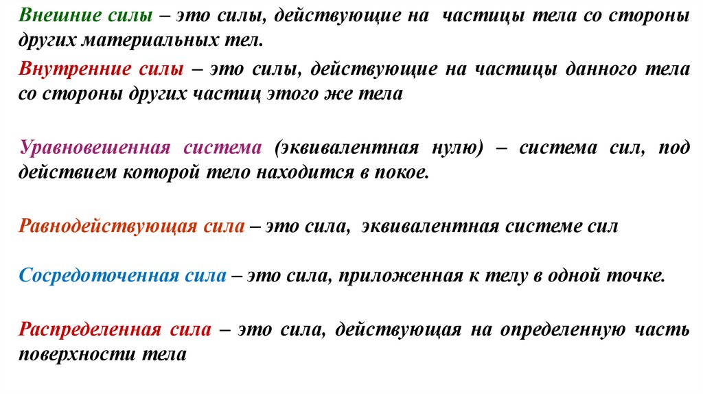 Внешние силы – это силы, действующие на частицы тела со стороныдругих материальных тел.