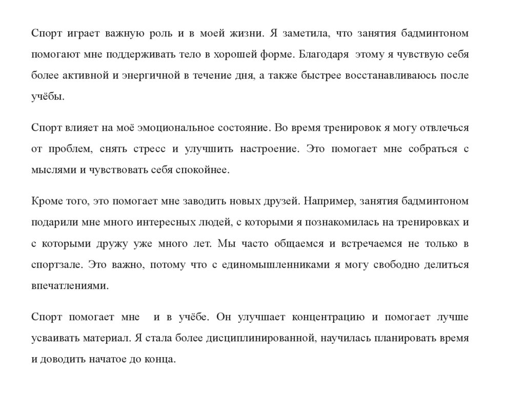 Спорт играет важную роль и в моей жизни. Я заметила, что занятия бадминтономпомогают мне поддерживать тело в хорошей форме. Благодаря этому я чувствую себя