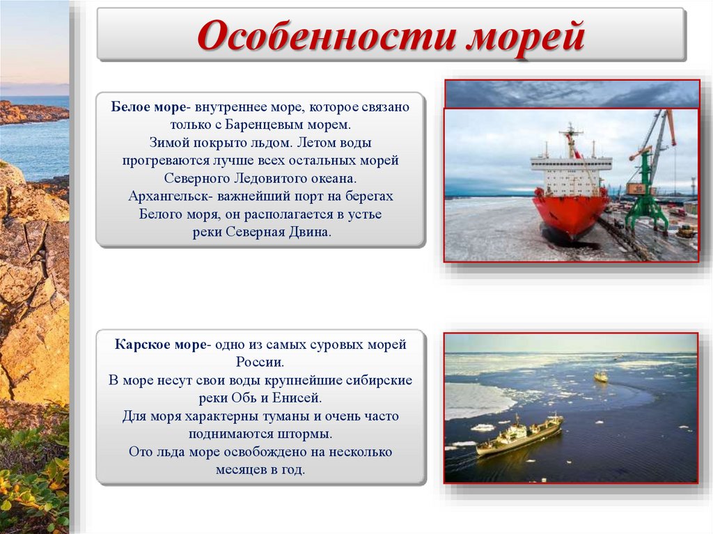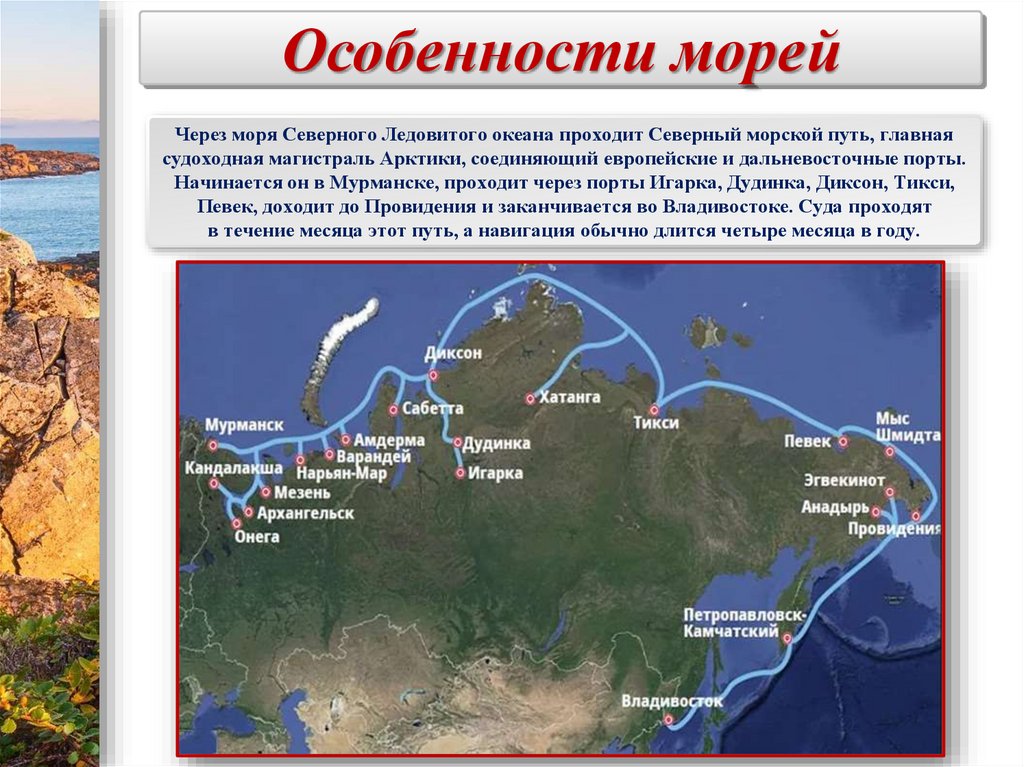 Особенности морейЧерез моря Северного Ледовитого океана проходит Северный морской путь, главная