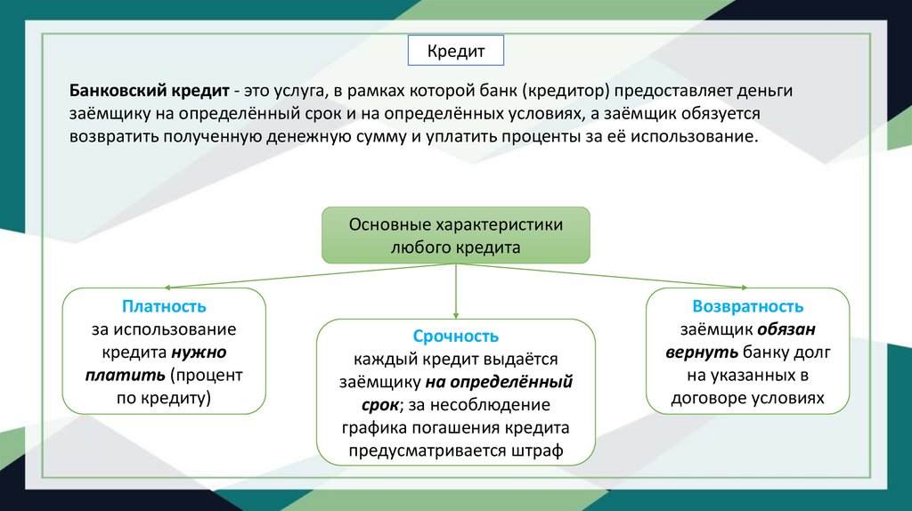 КредитБанковский кредит - это услуга, в рамках которой банк (кредитор) предоставляет деньги