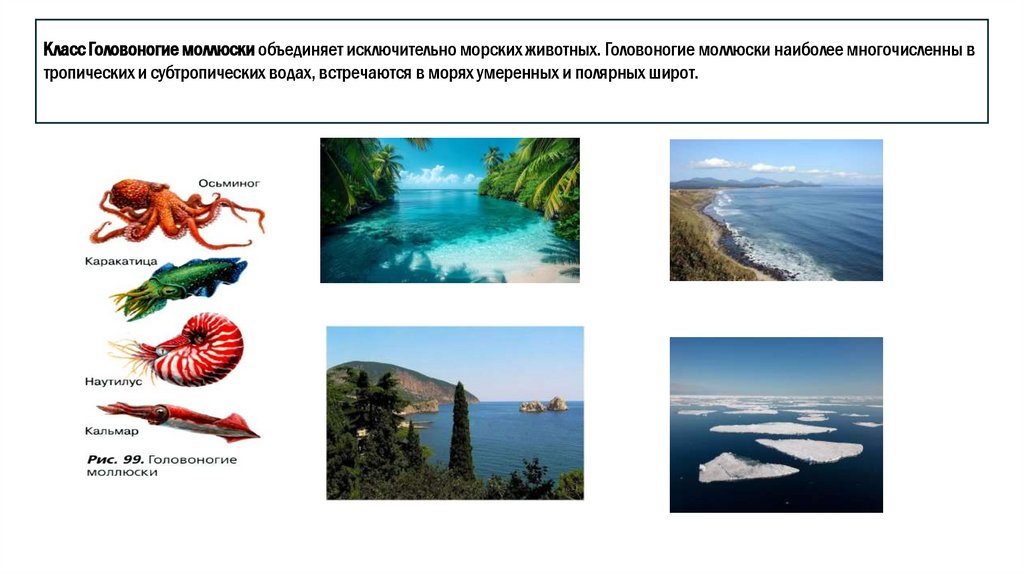 Класс Головоногие моллюски объединяет исключительно морских животных. Головоногие моллюски наиболее многочисленны втропических и субтропических водах, встречаются в морях умеренных и полярных широт.
