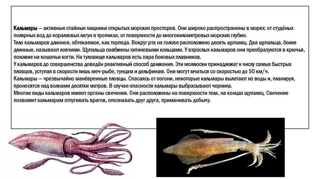 Кальмары — активные стайные хищники открытых морских просторов. Они широко распространены в морях: от студёныхполярных вод до коралловых лагун в тропиках, от поверхности до многокилометровых морских глубин.