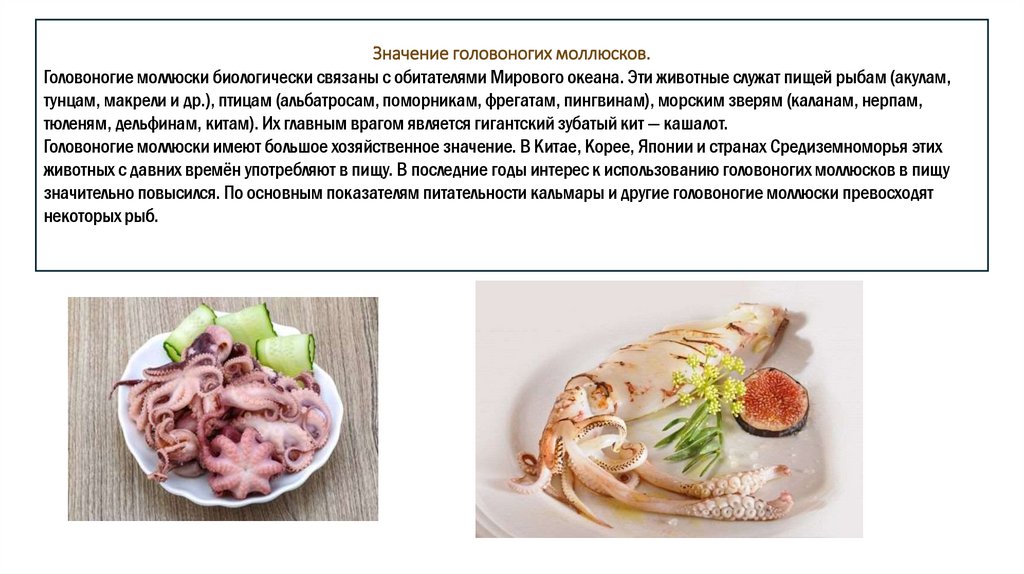 Значение головоногих моллюсков.Головоногие моллюски биологически связаны с обитателями Мирового океана. Эти животные служат пищей рыбам (акулам,