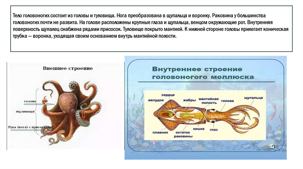 Тело головоногих состоит из головы и туловища. Нога преобразована в щупальца и воронку. Раковина у большинстваголовоногих почти не развита. На голове расположены крупные глаза и щупальца, венцом окружающие рот. Внутренняя