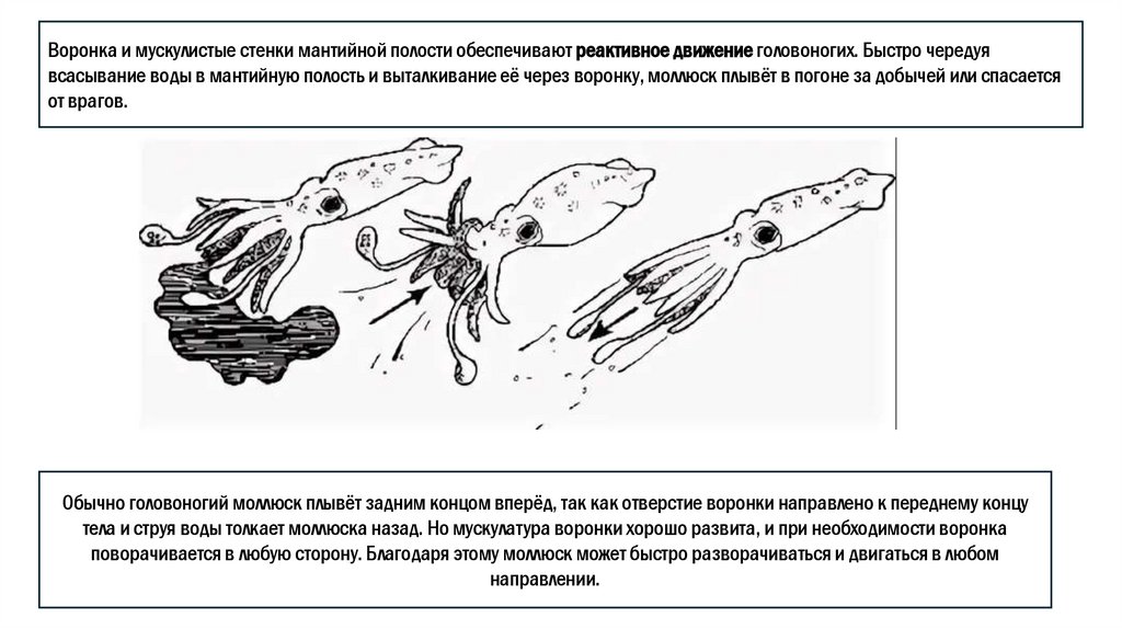 Обычно головоногий моллюск плывёт задним концом вперёд, так как отверстие воронки направлено к переднему концу