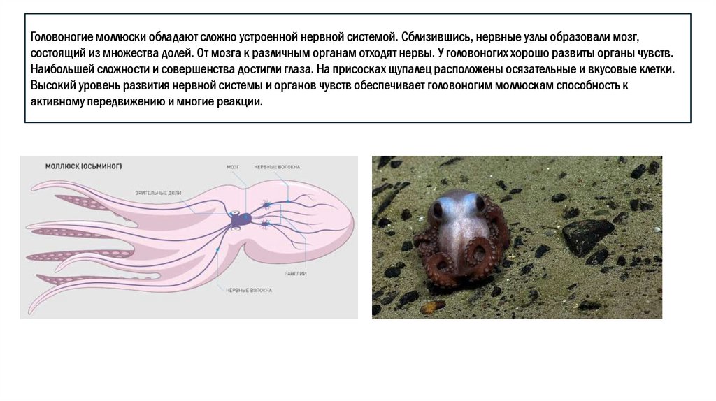 Головоногие моллюски обладают сложно устроенной нервной системой. Сблизившись, нервные узлы образовали мозг,состоящий из множества долей. От мозга к различным органам отходят нервы. У головоногих хорошо развиты органы чувств.