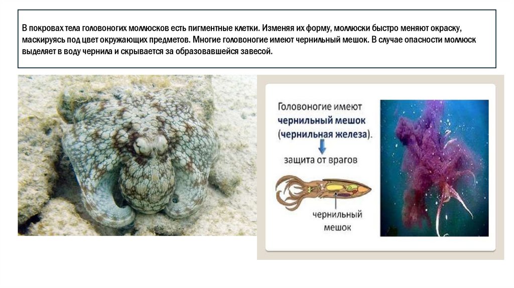 В покровах тела головоногих моллюсков есть пигментные клетки. Изменяя их форму, моллюски быстро меняют окраску,маскируясь под цвет окружающих предметов. Многие головоногие имеют чернильный мешок. В случае опасности моллюск