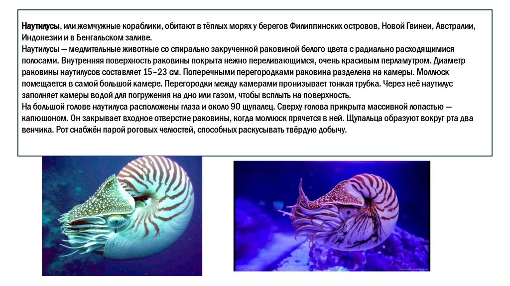 Наутилусы — медлительные животные со спирально закрученной раковиной белого цвета с радиально расходящимися